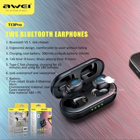 Awei T13 Pro In-ear Bluetooth Handsfree Ακουστικά με Αντοχή στον Ιδρώτα και Θήκη Φόρτισης Μαύρα
