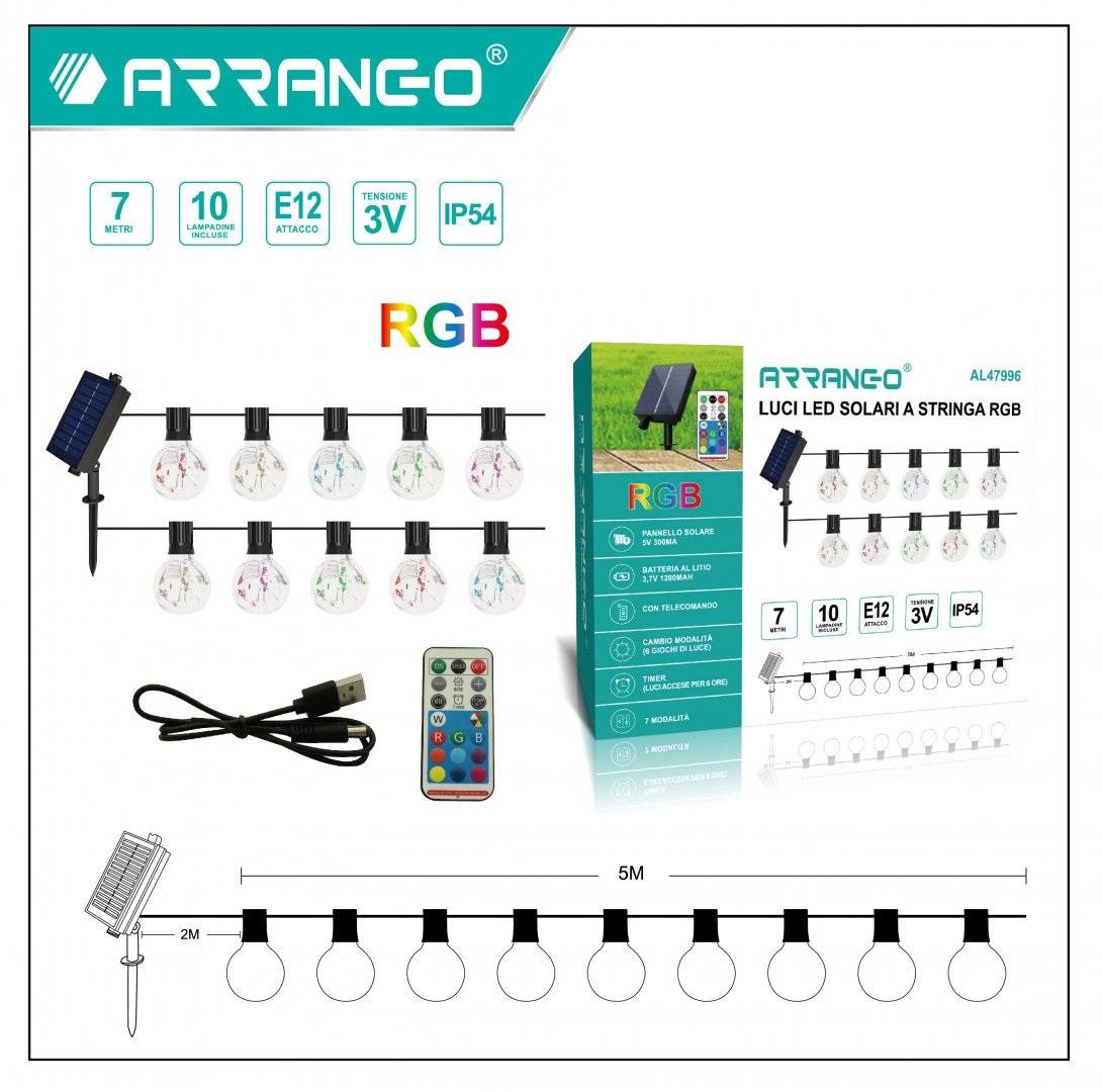 Αδιάβροχη Ηλιακή γιρλάντα φωτισμού με 10 LED λάμπες RGB Ε12 7Μ και χειριστήριο Arrango AL47996