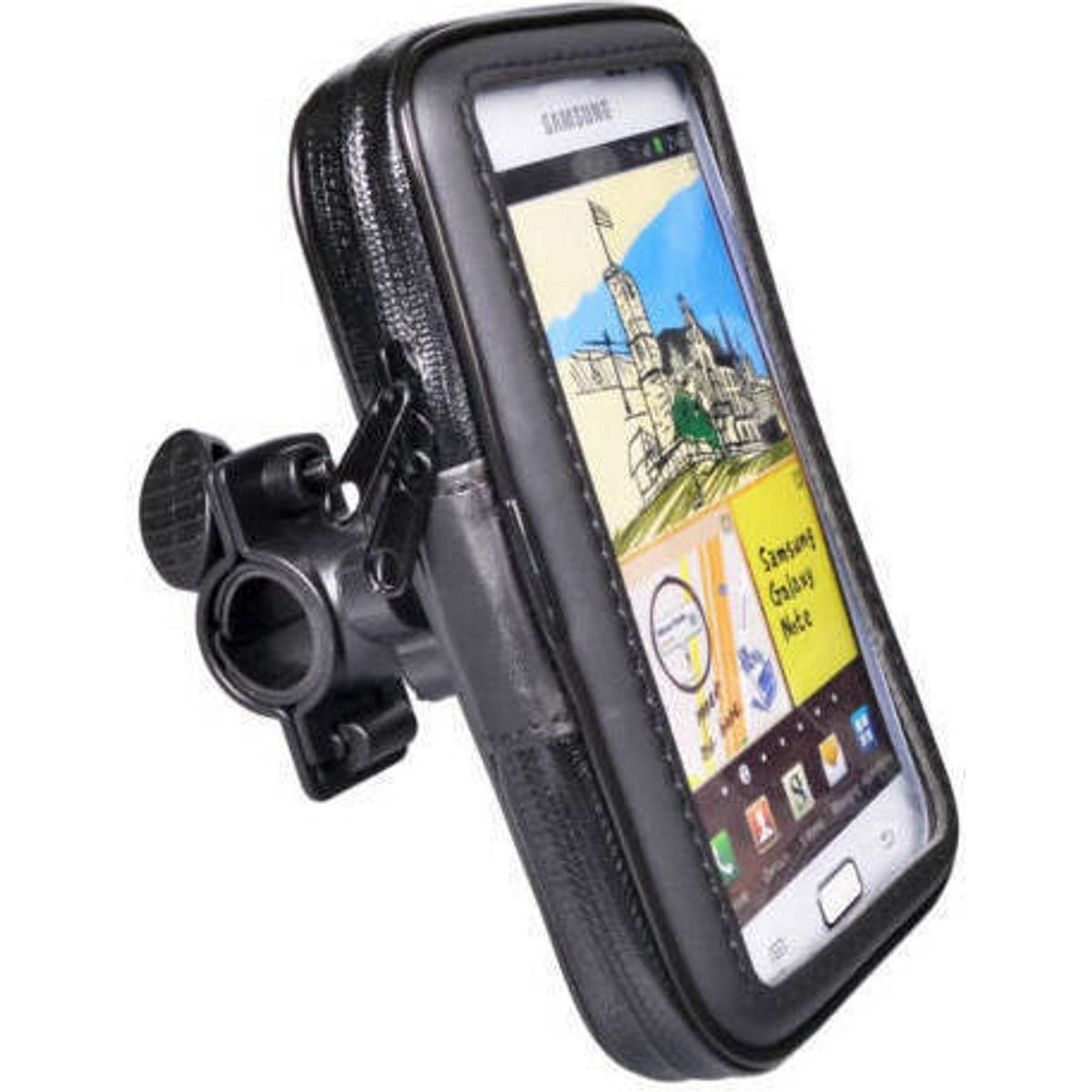 Βάση στήριξης κινητών Κινητού για μοτοσυκλέτες. Η βάση κλειδώνει με ρυθμιζόμενο αντάπτορα στη μπάρα του τιμονιού της μοτοσυκλέτας. Η στήριξη της συσκευής στη βάση γίνεται με θήκη. Αυτό σημαίνει ότι η συσκευή είναι προστατευμένη από σταγονίδια νερού, τη σκόνη και τον αέρα. Παράλληλα, διαθέτει περιστροφή για πιο εύκολη ρύθμιση της επιθυμητής θέσης της συσκευής.