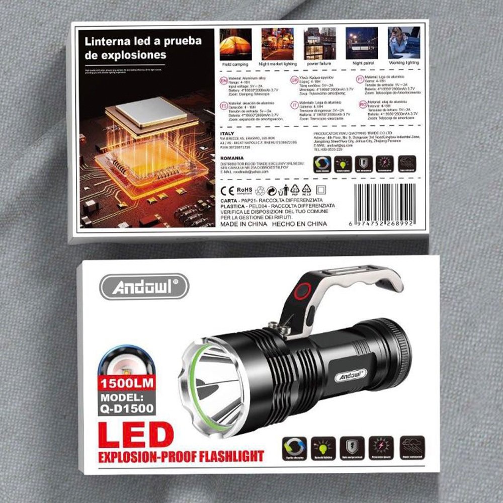 Φακός προβολέας LED της Andowl, κατάλληλος για χρήση σε εργοτάξια, σπίτι, αυτοκίνητο, εξοχή, κυνήγι, ψάρεμα και κάμπινγκ. Έχει ισχυρή ένταση φωτισμού που φτάνει έως 1500lm.