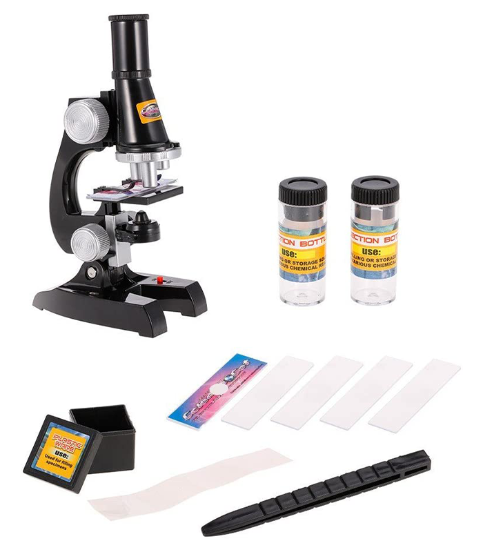 Η συσκευασία περιλαμβάνει: 1xΜικροσκόπιο, 1x Πλαστικό δοχείο, 2x Φιάλες συλλογής, 1x Κενή ετικέτα, 5x Δείγματα γυαλιού, 1x Λαβίδα.