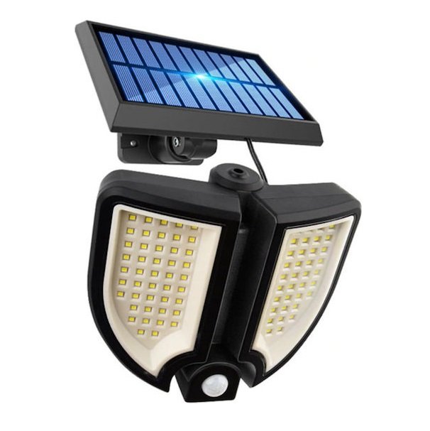Επιτοίχιο ηλιακό φωτιστικό σε μαύρο χρώμα, που συγκεντρώνει και αποθηκεύει ηλιακή ενέργεια για τη λειτουργία του, ώστε να μη χρειάζεται να συνδεθεί σε παροχή ρεύματος. Διαθέτει ανιχνευτή κίνησης για να ενεργοποιείται όταν εντοπίσει κίνηση εντός της εμβέλειάς του, αλλά και τηλεκοντρόλ ώστε να το χειρίζεστε από απόσταση.