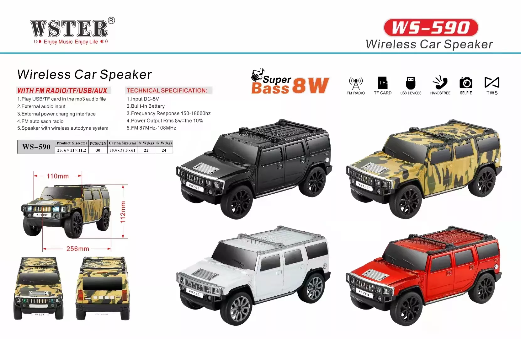 Φορητό ηχείο Hummer speaker car με BT, USB,TF, RADIO WSTER 20W WS-590 Κόκκινο