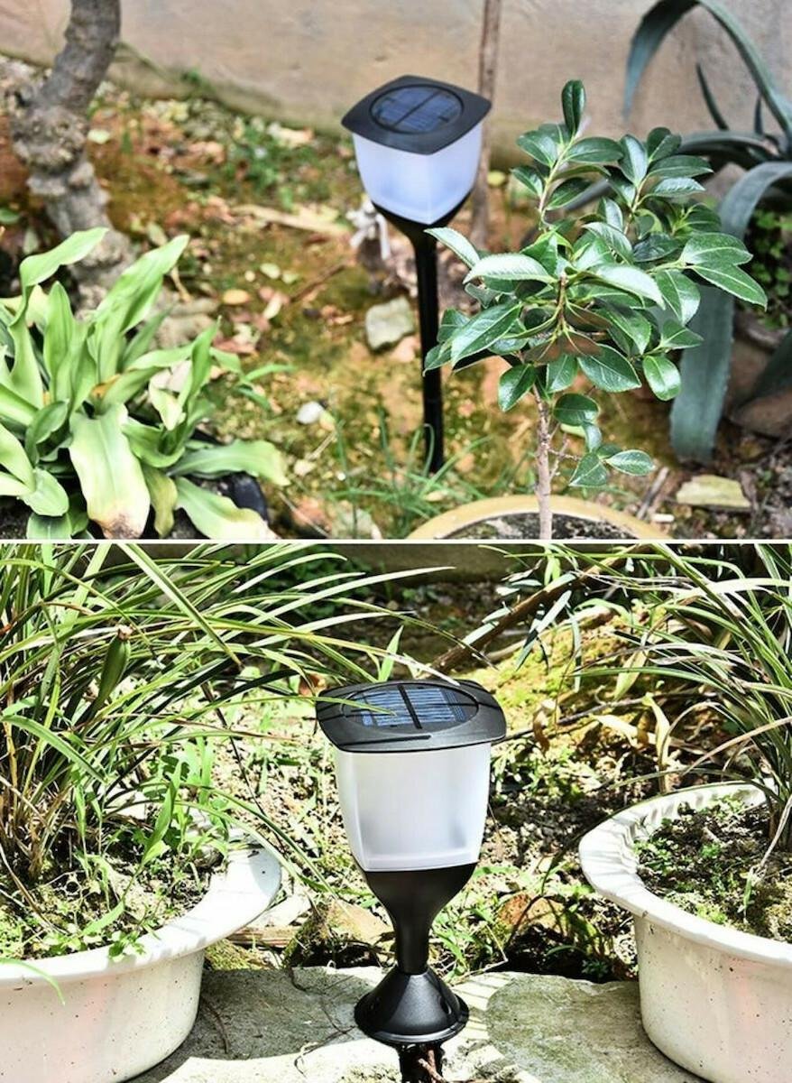 Ηλιακό φωτιστικό δαπέδου σε μαύρο χρώμα, που συγκεντρώνει και αποθηκεύει ηλιακή ενέργεια για τη λειτουργία του, ώστε να μη χρειάζεται να συνδεθεί σε παροχή ρεύματος. Διαθέτει αισθητήρα φωτός που του επιτρέπει να ενεργοποιείται αυτόματα κατά τη δύση του ηλίου.