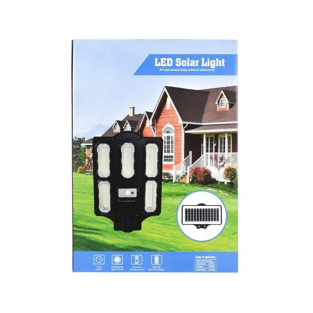 Ηλιακός προβολέας LED σε μαύρο χρώμα, με ισχύ 300W. Διαθέτει τηλεχειριστήριο για να το ελέγχετε από απόσταση. Εκπέμπει ψυχρό λευκό φως, το οποίο αποδίδεται στην κλίμακα Kelvin με τιμές από 5000Κ έως 6800Κ. Οι τόνοι του ψυχρού λευκού είναι πιο μπλε σε σχέση με το φυσικό φως. Διαθέτει βαθμό προστασίας IP65, που δηλώνει ότι έχει πλήρη προστασία από τη σκόνη, ενώ δεν εισέρχεται νερό που εκτοξεύεται με μεγάλη δύναμη (πχ. πιεστικό λάστιχο).