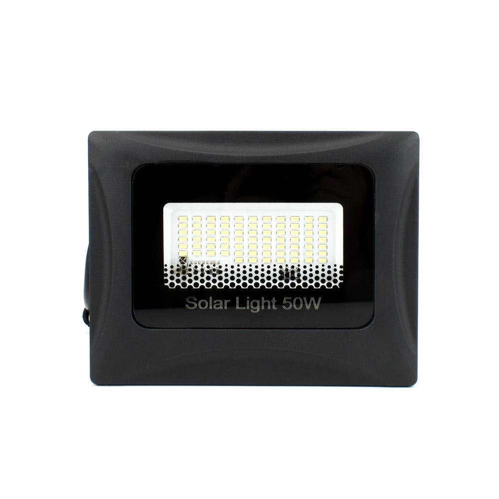 Ηλιακός προβολέας LED σε μαύρο χρώμα, με ισχύ 50W. Διαθέτει τηλεχειριστήριο για να το ελέγχετε από απόσταση. Εκπέμπει ψυχρό λευκό φως, το οποίο αποδίδεται στην κλίμακα Kelvin με τιμές από 5000Κ έως 6800Κ. Οι τόνοι του ψυχρού λευκού είναι πιο μπλε σε σχέση με το φυσικό φως. Διαθέτει βαθμό προστασίας IP65, που δηλώνει ότι έχει πλήρη προστασία από τη σκόνη, ενώ δεν εισέρχεται νερό που εκτοξεύεται με μεγάλη δύναμη (πχ. πιεστικό λάστιχο).