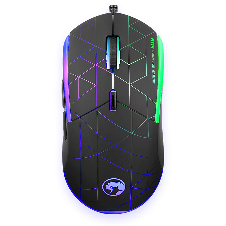 To Marvo M115 είναι ένα ενσύρματο gaming ποντίκι σχεδιασμένο και για τα δύο χέρια, με οπτικό αισθητήρα και ανάλυση 4000 DPI. Διαθέτει 6 κουμπιά και φωτισμό RGB που μπορεί να πάρει διάφορες αποχρώσεις.