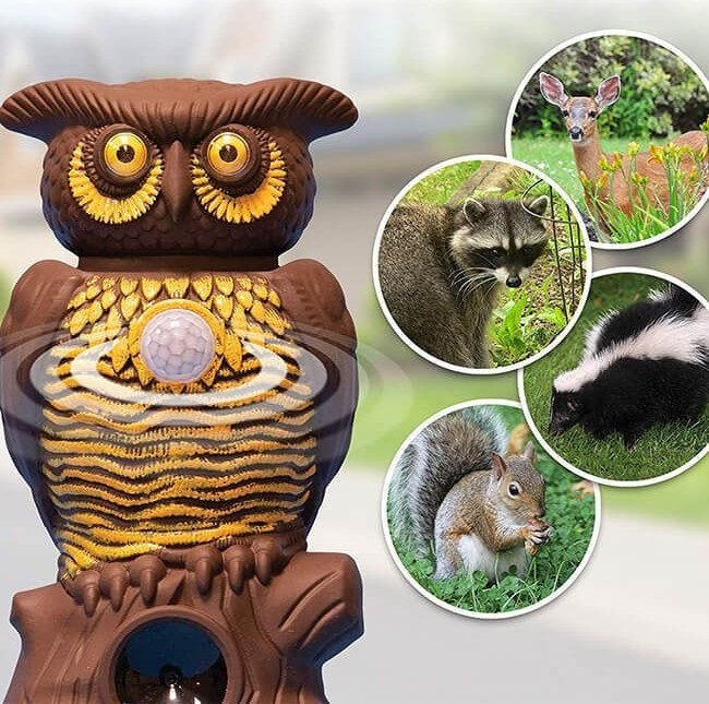 Ομοίωμα κουκουβάγιας το οποίο εκπέμπει υπερηχητικό ήχο που στοχεύει και ενοχλεί τα ζώα από το να πλησιάσουν, χωρίς να είναι βλαβερό για αυτά. Όταν υπάρχει ζώο στην εμβέλεια της συσκευής, λειτουργεί ο ανιχνευτής κίνησης και αυτόματα ενεργοποιείται ο ήχος και το φως απώθησης.