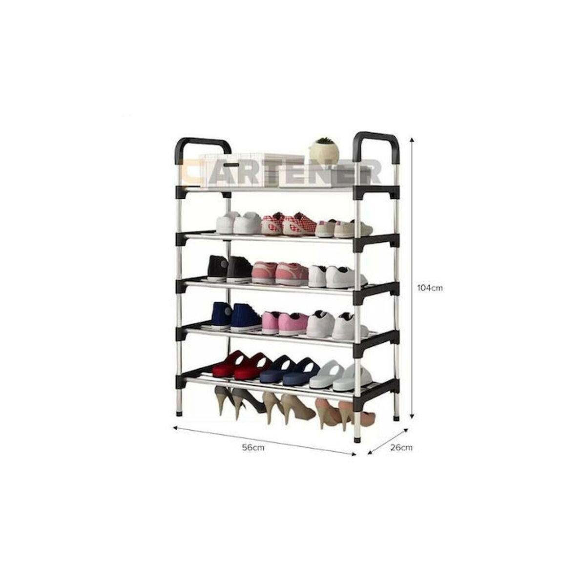 Η παπουτσοθήκη διαθέτει 5 ράφια για την οργάνωση, αποθήκευση και προστασία των παπουτσιών σας και είναι κατασκευασμένη από μέταλλο και πλαστικό.