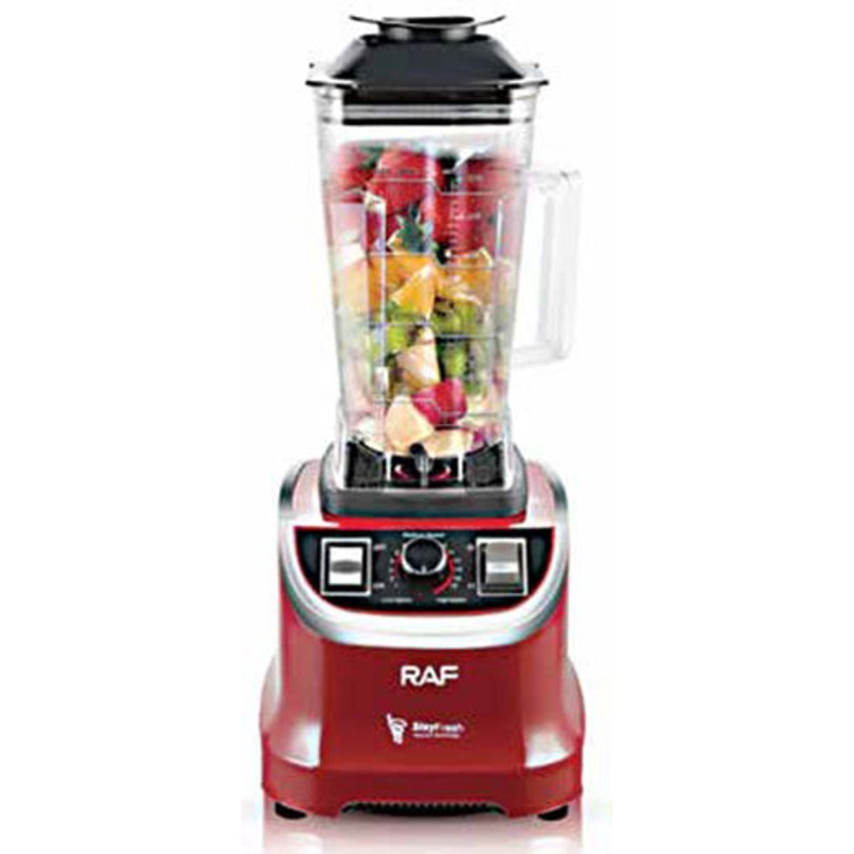 Το μπλέντερ της εταιρείας Raf έχει ισχύ 1800W, ικανή για να αλέσει υγρά όπως χυμό ή γάλα και φρούτα, ακόμη και ξηρά υλικά όπως δημητριακά ή νιφάδες βρώμης.