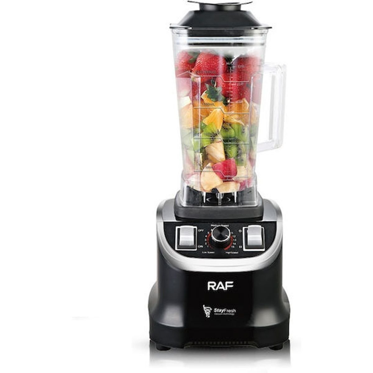 Το μπλέντερ της εταιρείας Raf έχει ισχύ 1800W, ικανή για να αλέσει υγρά όπως χυμό ή γάλα, φρούτα, καθώς και ξηρά υλικά όπως δημητριακά ή νιφάδες βρώμης. Διαθέτει κανάτα χωρητικότητας 2 λίτρων, η οποία μπορεί να καλύψει τις ανάγκες μιας μεγάλης παρέας και να βγάλει περίπου 5 με 7 ποτήρια ροφήματος.