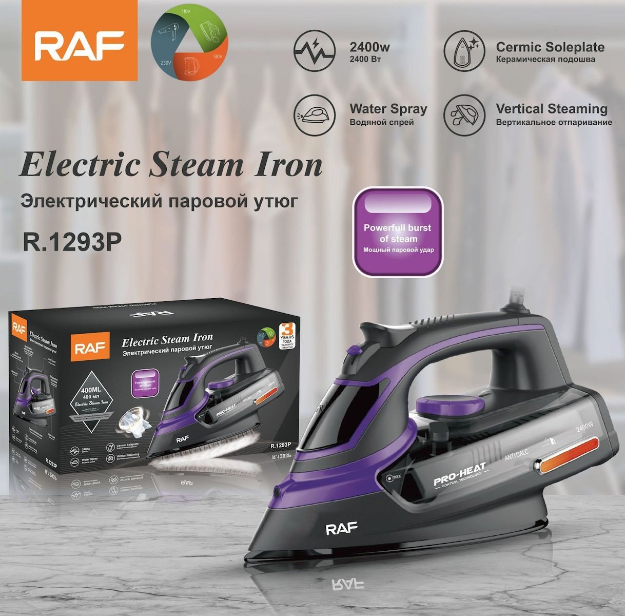 Σίδερο ατμού 2400W μωβ/μαύρο με αντικολλητική πλάκα RAF R.1293P