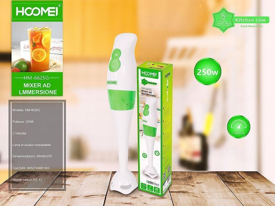 Ραβδομπλέντερ HM-6625G, της εταιρείας Hoomei, με ισχύ 250 Watt. Με το ραβδομπλέντερ θα μπορέσετε να πολτοποιήσετε τρόφιμα για παιδικές τροφές, να ομογενοποιήσετε σάλτσες, να φτιάξετε σπιτική μαγιονέζα, να δημιουργήσετε smoothies από οποιοδήποτε φρούτο επιθυμείτε ή ακόμα και να ετοιμάσετε σούπες. Είναι πολύ πρακτικό, εύχρηστο και καταλαμβάνει λιγότερο χώρο, σε σχέση με ένα επιτραπέζιο μπλέντερ. Μεγάλο του πλεονέκτημα αποτελεί το γεγονός ότι μπορείτε να επεξεργάζεστε τα υλικά σας μέσα σε οποιοδήποτε σκεύος, χωρίς να χρειάζεται να τα μεταφέρετε και να συσσωρεύονται στην κουζίνα σας διαρκώς άπλυτα σκεύη. Κατά τη διάρκεια του μαγειρέματος καλό θα είναι να έχετε πάντα την κεφαλή βυθισμένη μέσα στα τρόφιμα που επεξεργάζεστε, ώστε να αποφεύγονται ανεπιθύμητα πιτσιλίσματα αλλά και τυχόν εγκαύματα, στην περίπτωση που το τρόφιμο που επεξεργάζεστε είναι ακόμα καυτό.