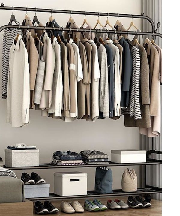Ανοιχτή διπλή ντουλάπα οργάνωσης ρούχων πολλαπλών επιπέδων, κατασκευασμένη από μέταλλο. Εύκολη στη συναρμολόγηση και κατάλληλη για πολλαπλές χρήσεις, ενώ διαθέτει ρόδες για εύκολη μετακίνηση. Μπορεί να χρησιμοποιηθεί ως ράφι παπουτσιών, κρεμάστρα για ρούχα, καπέλα, παπούτσια, τσάντες, ομπρέλες. Ιδανική για σπίτια βραχυχρόνιας μίσθωσης, ξενοδοχεία και φοιτητικά σπίτια.
